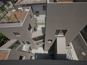 1階建て、6世帯の住人が暮らす長屋形式の集合住宅です。都会の限られた敷地状況を鑑み、住人どうしの距離感や集まって住